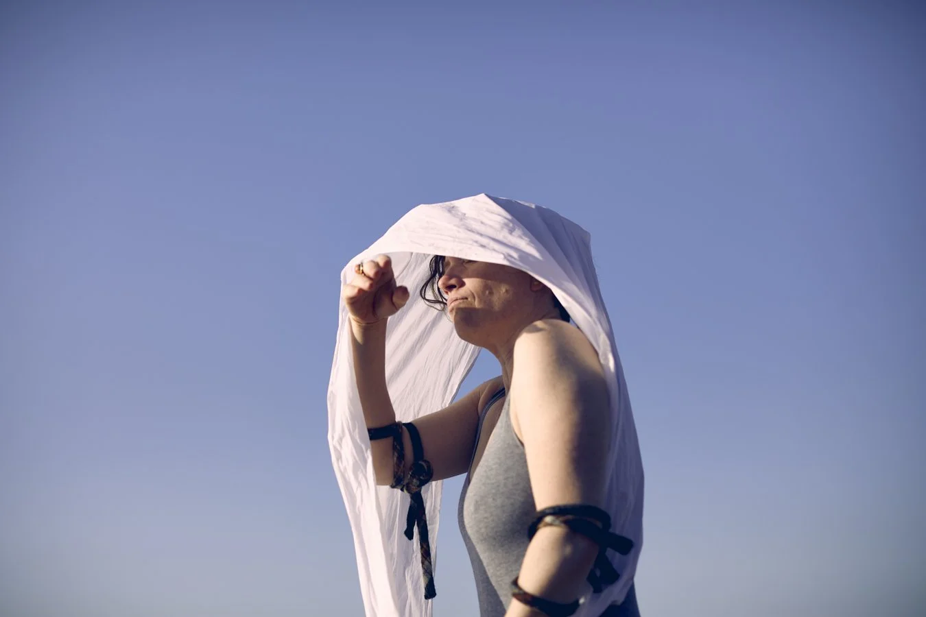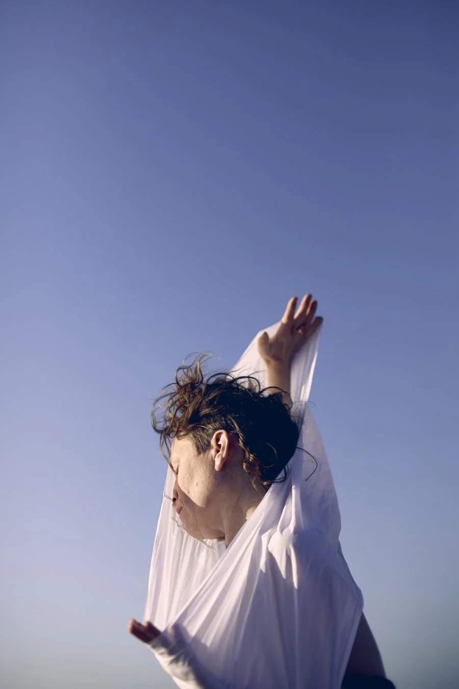 Natasha: I was exploring restraints and sensory tools—hoods, belts, materials that help us feel our edges. For some neurodivergent people sensory regulation is really important. In the shoot I was using materials to stim, to feel where I was in space. Movement helps me communicate when I can’t speak, I have a painting by a neurodivergent artists where she’s trapped in a jumper she’s taking off - this expresses the frustration of communication. And that morning of shoot by the sea—God, it was stunning. The light was so blue, so soft.