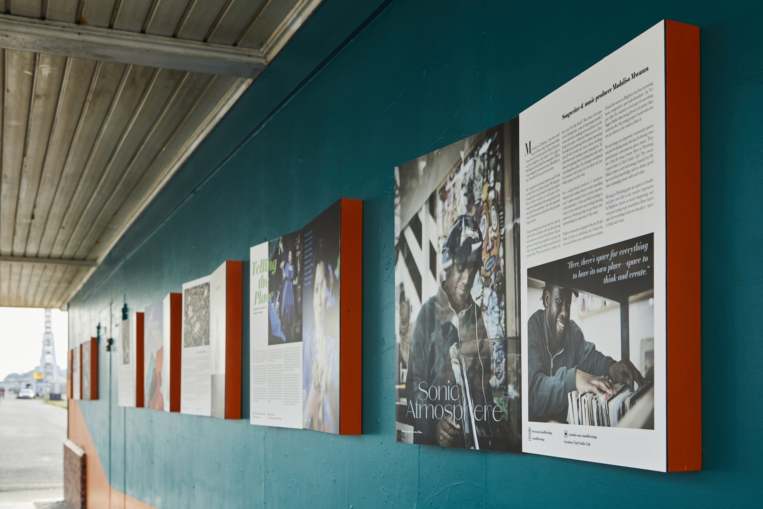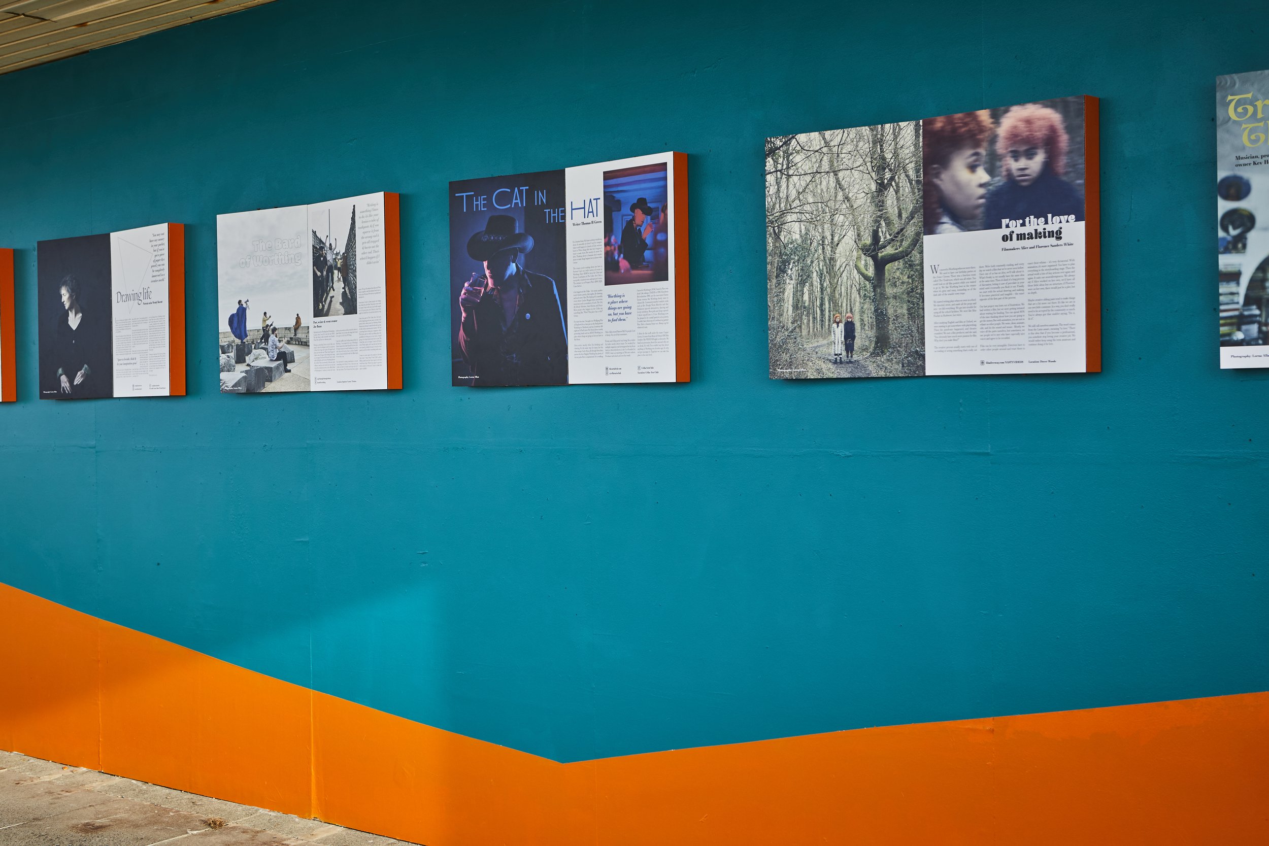 Portraits and interviews were displayed as large-scale editorial spreads, mounted on angled wedges to create depth and a three-dimensional, book-like experience. This approach turned the space into an immersive publication, celebrating the diversity and varied creative community.
